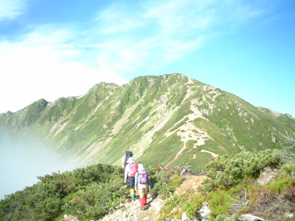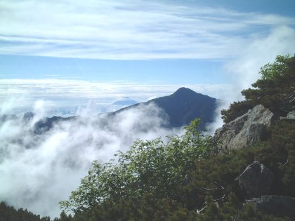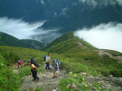 雲海を下に見て登る。小千丈ヶ岳のすぐ下