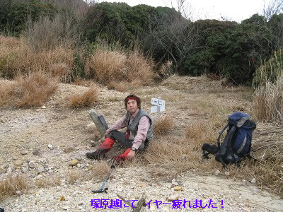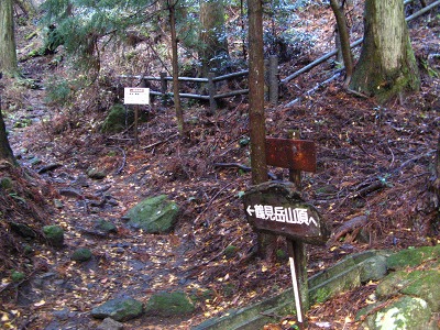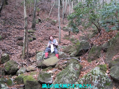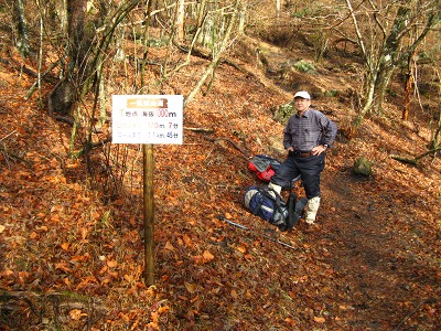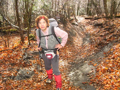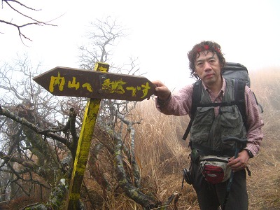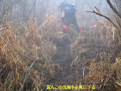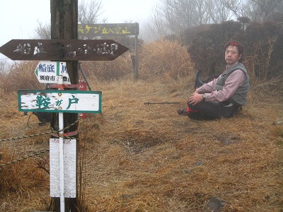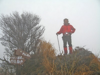 船底から内山へは同じような斜面を登っていくのだがここは登りでジグザグに道がついているので、先ほどの下りとはだいぶ違って助かる。内山の山頂も懐かしい表札?があったがここも全く視界は利かない。そこで昼食にし、お湯を沸かし熱いラーメンを食べて一息つく。ここからの塚原越までの下りも注意深くそろりそろりと下る。落ち葉の上なので大丈夫だろうとポンと足を乗せるとズルッと滑ったりと悪戦苦闘で鍋山の露天風呂に着いたときは、地獄から天国へやってきたようだった。