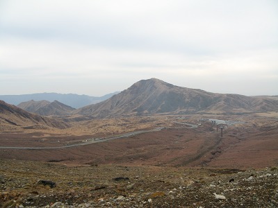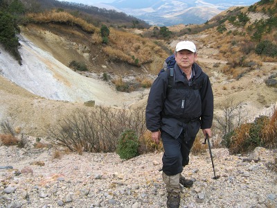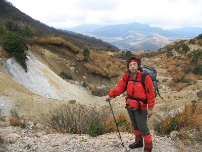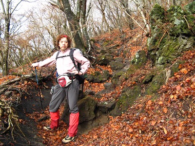 そこから明礬に向かっての縦走コースを歩き始めたが、昨日の雨で真っ黒の火山灰特有の登山道は泥んこで滑りまくる。特に鞍ヶ戸を過ぎて内山の取り付きになる船底までの下りの道はロープがあってもほとんど役立たない。ロープにつかまってもずるずる下へと滑り宙吊り状態になる。小さな木や草につかまりながらやっと船底についたときは、体力の限界と思えるほど疲れた。