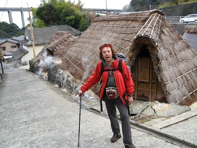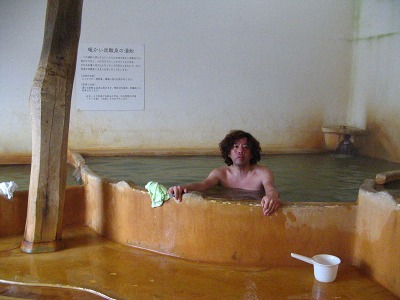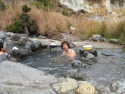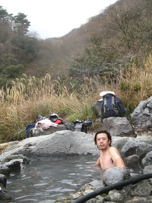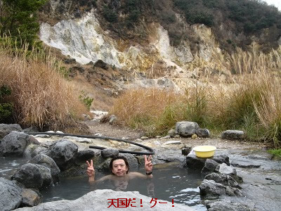 さっそく露天風呂に飛び込む。ちょうどいい湯加減、素晴らしい周りの景色、鳥の声しばらくここで昼寝をしたくなった。露天風呂を上がり、さあこれから歩いて鉄輪温泉まで頑張ろうと思って、そこから数分の林道の駐車場まで下りたら、そこに車を止めていた中年の男性が声をかけてきた。明礬温泉の方に行くのなら乗りませんかと一瞬耳を疑うかのようなありがたい言葉。勿論即OKで明礬温泉まで乗せてもらった。歩けば2〜30分かかるところありがたかった。