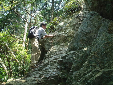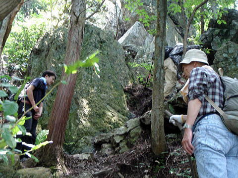 | 右の写真の狭い岩の割れ目の入り口の前 | 岩の間をすり抜けて登る(体が通らない人もある?) | |