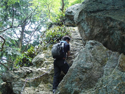 | 割岩コースは鎖を伝って岩の間を登っていく | このあたりからかなり急登の岩場の道が山頂まで続く | |